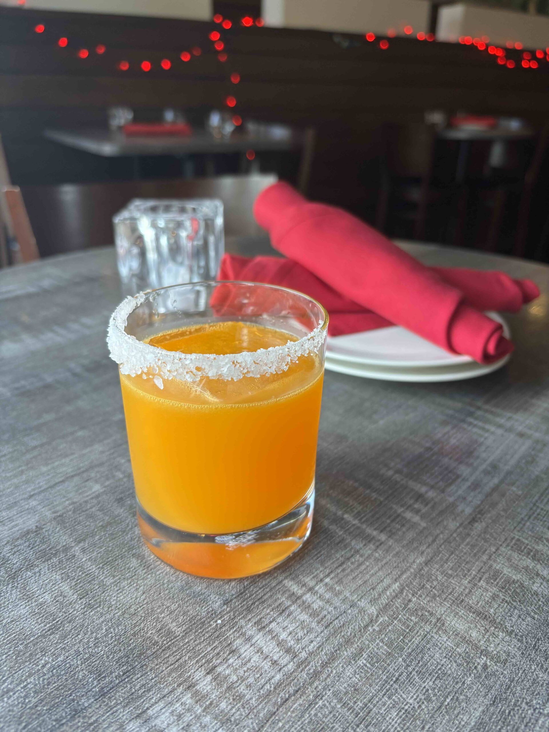 del maguey vida mezcal, carrot & lime juice, cinnamon simple syrup, and orange bitters with a salt rim